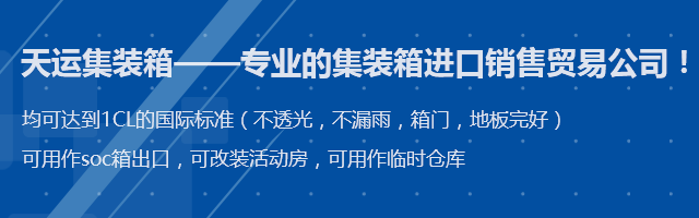 青島天運(yùn)集裝箱服務(wù)有限公司,是專業(yè)的集裝箱進(jìn)口銷售貿(mào)易公司,公司與各大船公司租箱公司保持著密切的合作關(guān)系,箱源充足,所有出售集裝箱均可達(dá)到IICL的國(guó)際標(biāo)準(zhǔn)(不透光,不漏雨,箱門,地板完好)可用作soc箱出口,可改裝活動(dòng)房,可用作臨時(shí)倉(cāng)庫(kù)。